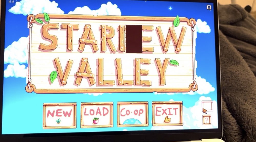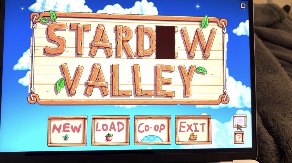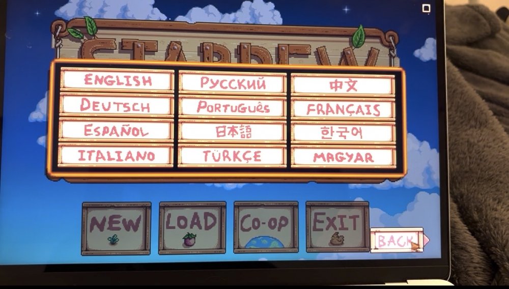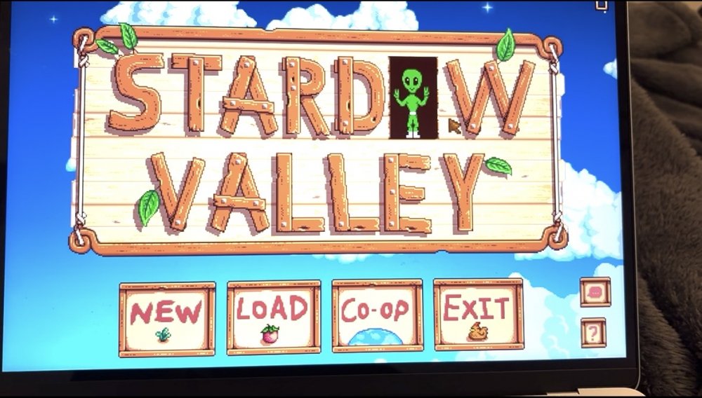 I found a bug with the change language menu on the title screen. I know there are various secrets on the title screen, and that the alien behind the E is just one of them, but it's the largest and most noticeable. This effect happens with the junimos and the leaf particles as well. When I click on the change language menu, the secrets get moved slightly to the left. The third image is after exiting the menu once, and the fourth is after exiting multiple times. This is not the furthest it will go; it will keep shifting left until it is no longer on the screen.