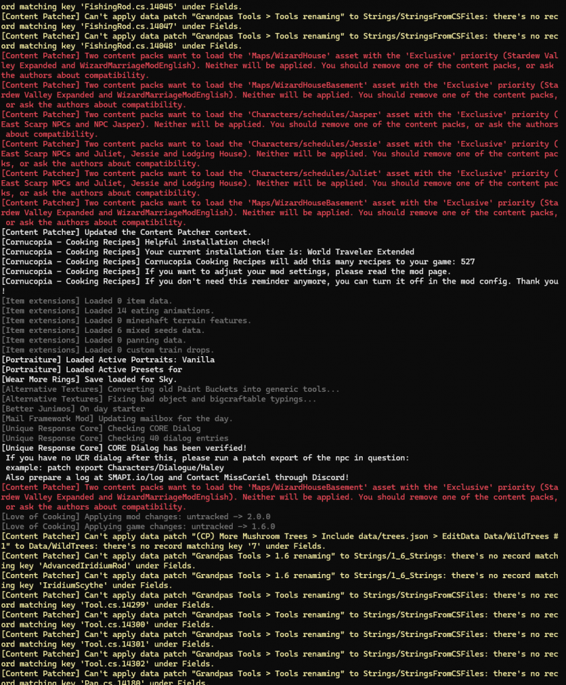 Hey there guys I want to preface this by saying with the 1.6 update, I expected a bunch of mod issues. I have both East Scarp and Ridgeside installed, but from the get go Ridgeside's steps didnt show up and it seems the mod may not be loading in at all. This is fine, I'm kind of attached to this playthrough so I decide to just keep playing. But now I cant finish the introductions quest as two people from East Scarp aren't loading into the game at all. I tried to follow the walkthrough to upload the SMAPI log but I am going to be honest...my ADHD brain is struggling with figuring out how to upload the log and win+r isnt working so Im going to paste the log directly here (im so sorry I will figure out how to upload it correctly tomorrow morning)