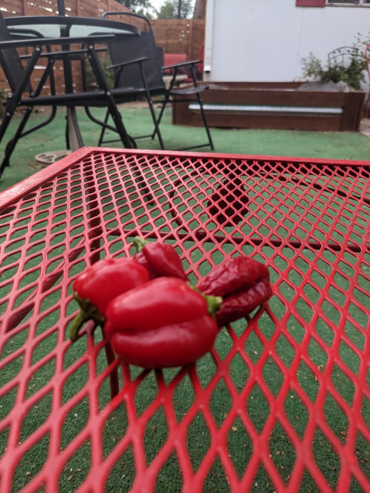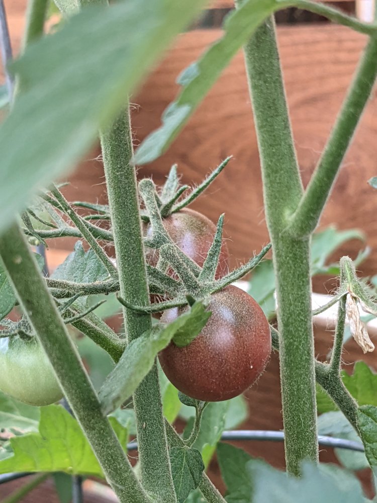 A couple of purple tomatoes and some peppers.