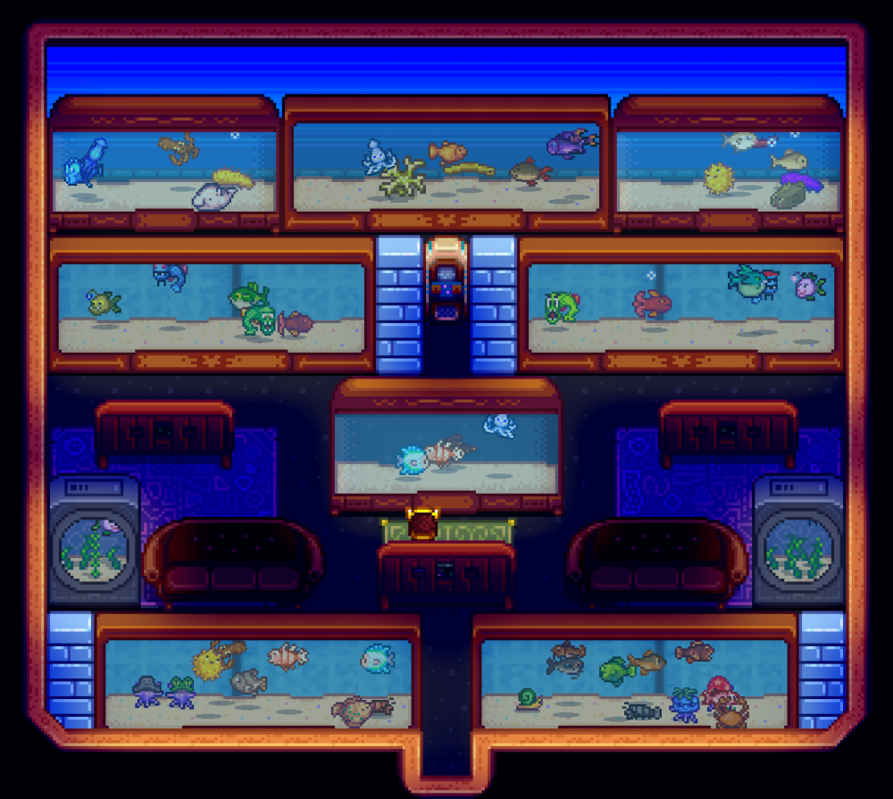 thank you! i wanted to keep it more tidy without too much details. because it's sometimes takes dozen screenshot that you can almost see every fish in the tank. i uploaded a vid on reddit https://www.reddit.com/r/StardewValley/comments/1e43hsg/my_soothing_aquarium/ with nice music where it's easier to see every detail. it's a sea urchin where you can put hats onThat is beautiful! Great color choices. I like that you stuck with the aquarium lighting only, too. Are you going to add any decorative items to the tanks, or do you think that might end up too cluttered for what you're going for here?