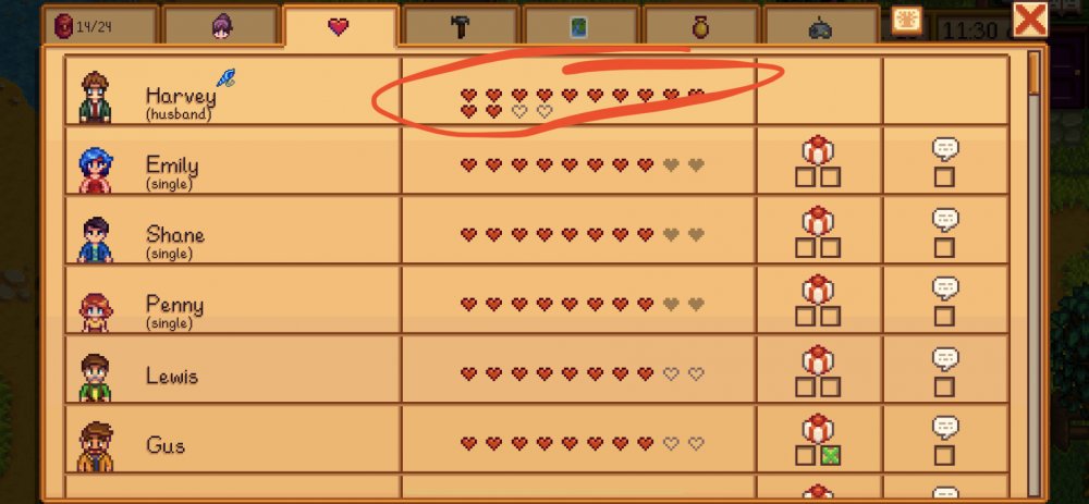 1. I can see in the relationship tab that up to 14 hears are available with my spouse, but when talking to them it still says 12/12 hearts