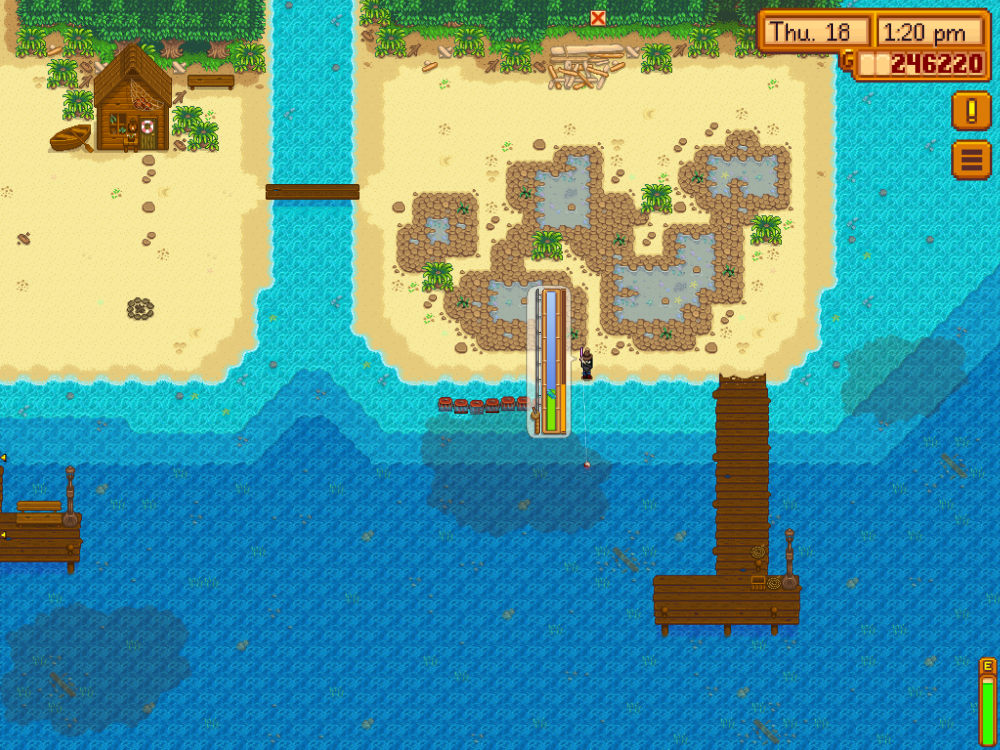 Third issue: the animated green bar when casting the line while fishing is slightly misaligned with the graduated background (towards the top). Sorry, I did not manage to screen this.