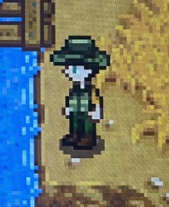 This is my current in-game outfit. Lime green tunic, farmer pants, fedora, cinderclown shoes. It's about the same I made during character creation. The only changes I've made are the boots and adding the hat (as well as trying different winter hats, before just staying with my faithful fedora).