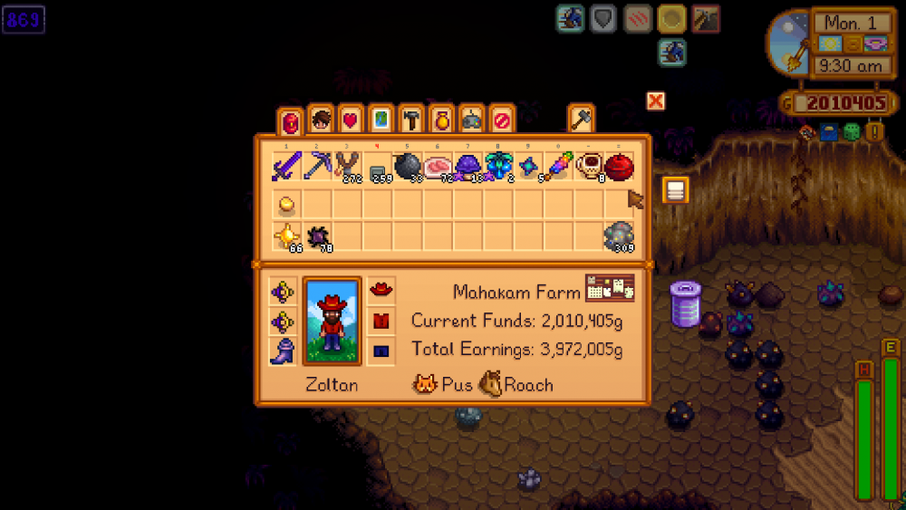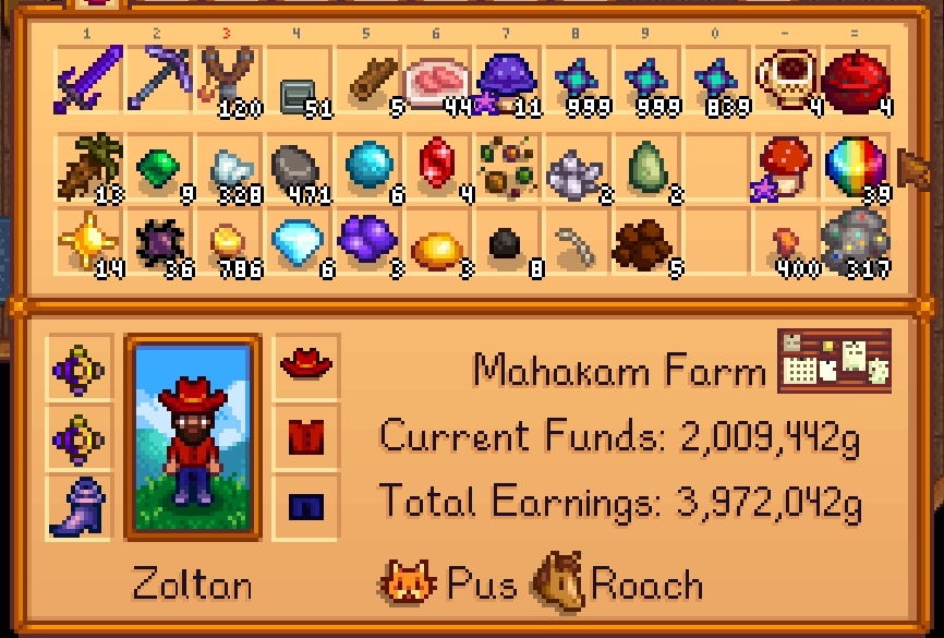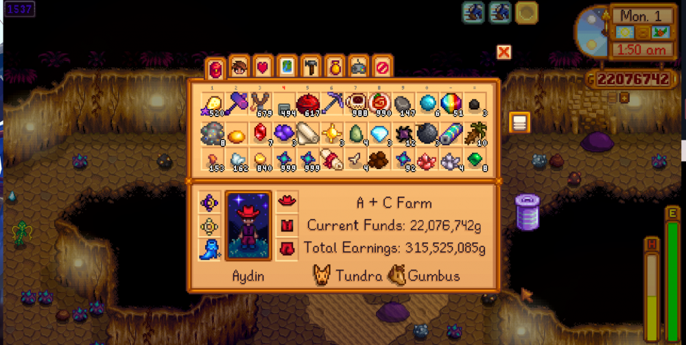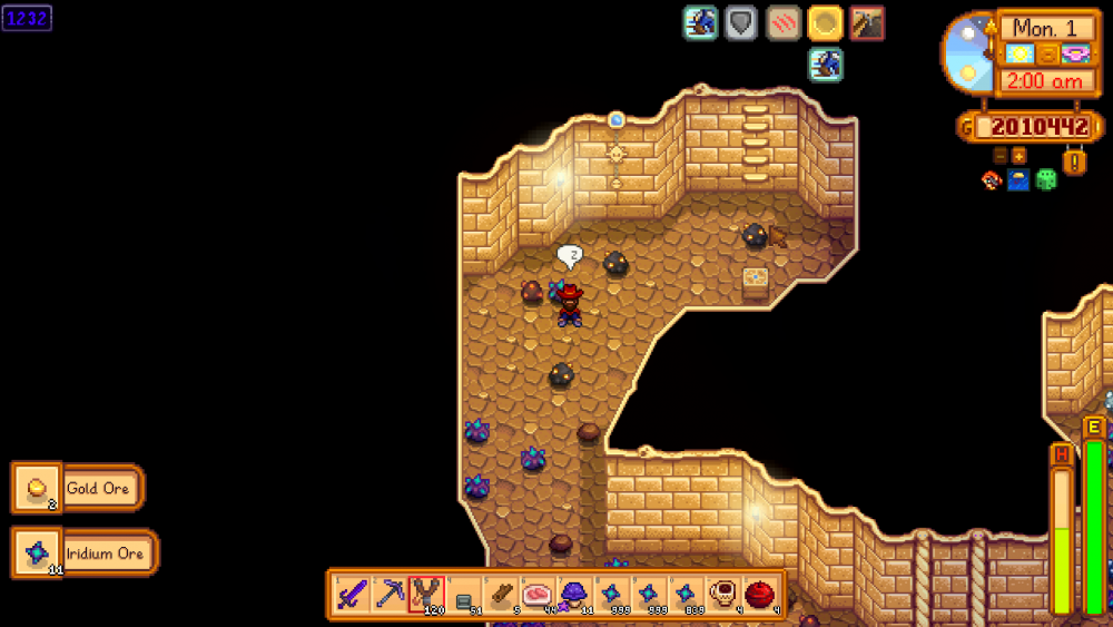 Will have to play around with the zoom level too then, hah. The worry is that I mess up even more when needing to use the pickaxe, clicking on stairs/holes, and particularly when trying to place stairs after having moved around. I keep wasting a lot of time because the character is stuck between two tiles or something, making everything 'red'. But like with the pause buffering technique and the slingshot, will need to practice it a lot more. The pace earlier wasn't exactly slow either, but can also save a lot more time overall if I decide to go even deeper before starting to mine. Floor 400 vs 1200 is a pretty huge difference! Then again, if I can get two stacks of iridium ore somewhat consistently moving forward by starting on floor 400-ish, that's not a bad place to be :P