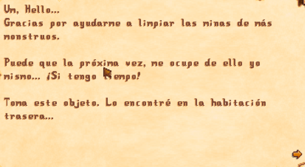 Moderator note: this should be fixed in Stardew Valley 1.6.9./Data/mail.es-ES:158: "ClintReward2": "Um, Hello...View attachment 21337