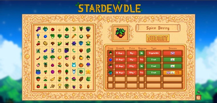 My friend and I recently took on a project to create a Wordle-like game for Stardew! We decided to go with guessing for crops. You can make guesses based on growth time, base price, whether the crop regrows, the type of crop, as well as the season. There's even a collections page so you can brush up on crop information. Give it a shot! Let us know what you think.