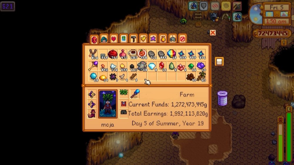 Today, after years and years of attempts, I beat my iridium ore record! (Previously was 999+999+725). I went on a “very happy!” luck day, +1 ore from nodes and crit chance from statues, and ate two magic rock candies. Eventually I hope to reach three 999 stacks of iridium, but even this took SO many tries, I don’t know if that’s possible for me. Playing on switch with a controller. Wish that staircase buffering was easier, but the best I can manage is 100 floors every 50 in game minutes (and that’s doing it perfectly, which doesn’t happen often). I also wasted time bombing floors with just 4 or 5 nodes. Room for improvement for sure…