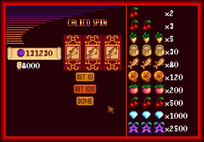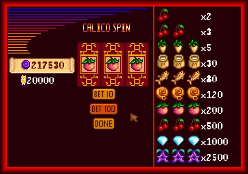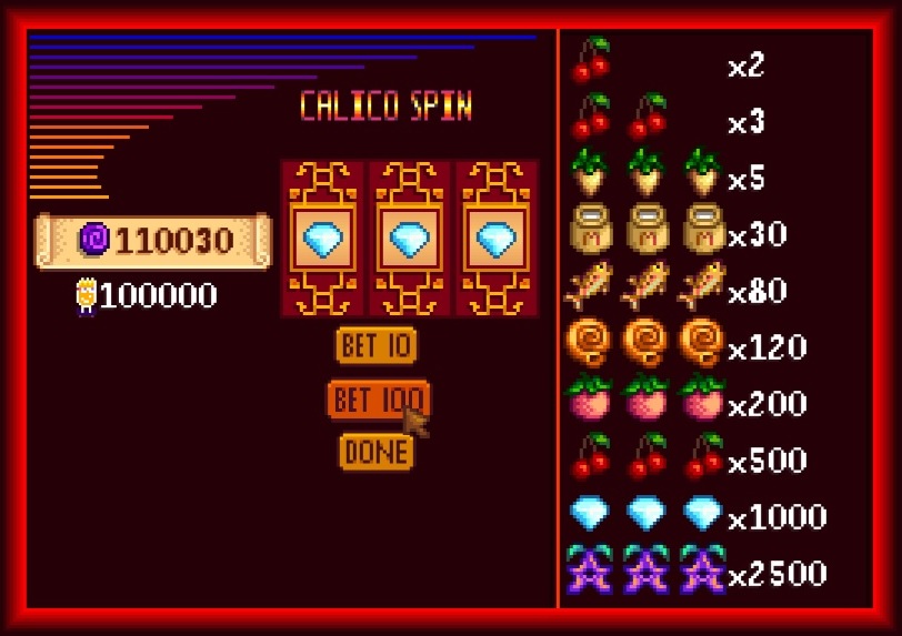 In my Stardew Expanded game, I came into the Casino for the very first time on this save. I had the best possible luck that day so once I put down 1000g to buy my initial 100 Qi Coins and arrived at the Slot Machine area, I chomped down on some Magic Rock Candy (+5 Luck), gulped down an Aged Blue Moon Wine (+7 Luck), and made sure that I was wearing my Lucky Ring (+1 Luck) before deciding to play the Slots until I won absolutely nothing on any spin. Little did I know that I would end up playing like a "gambling addict" for around 30 minutes! Here's what happened: