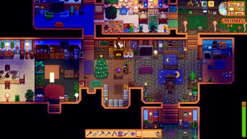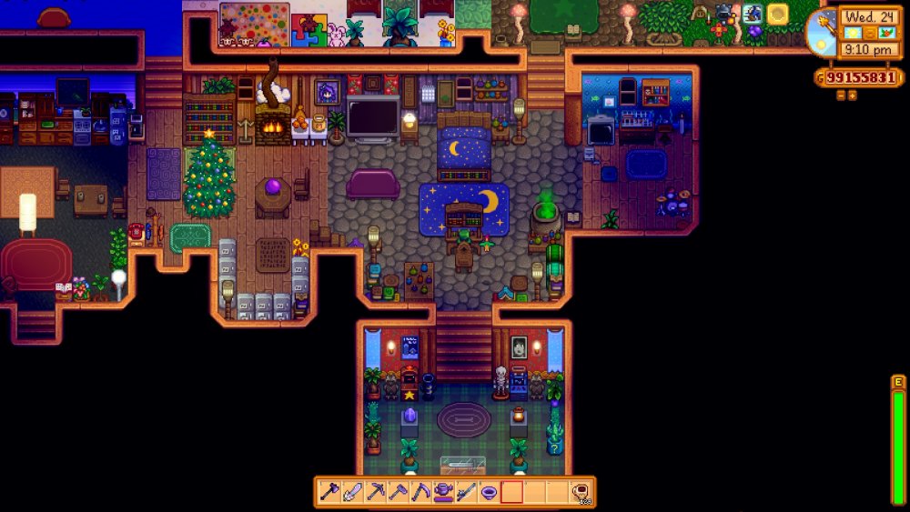 Day 28 of Year 6, final send off of my house, although I might replace the 2 table-top items in the adventure room in the south with the two artifacts that Abby likes: ancient sword and bone flute. (I'm mainly spending my last day breaking open all my stored artifact troves and geodes, and I've got hundreds of the latter. Since he's an upcoming marriage candidate, it's only fair I throw him a bone with a few hundred geodes and troves and boxes, right?)
