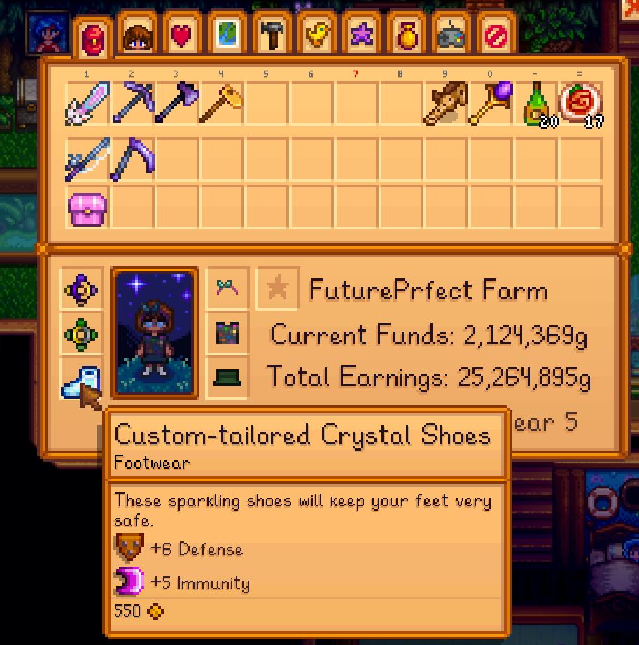 I like to think Lew achieves perfection Y1 Spring 1.Spring Year 5 is finally done as I've had less motivation after reaching perfection on the 1st of this season, so it's been slo. This season has been more about quality of life than game accomplishments. Next season will be: Journey of the Prairie King