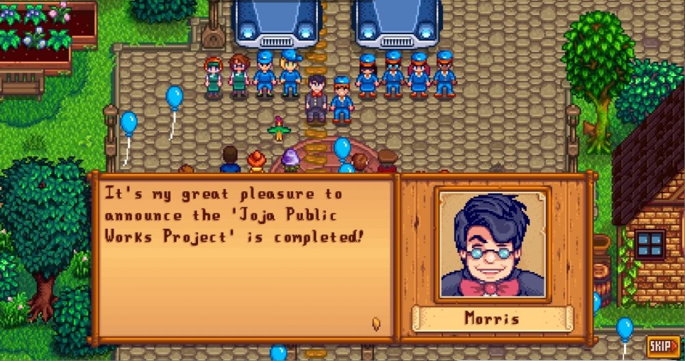Wow I’ve never done Joja on the SDVE yet. I had no idea he became the new mayor (that’s a real coin toss who’s worse) and it had such a direct impact on the families and their storylines. Normally they just say I don’t know how the bus, coal cart, bridge, etc got magically repaired. A true mystery they say.