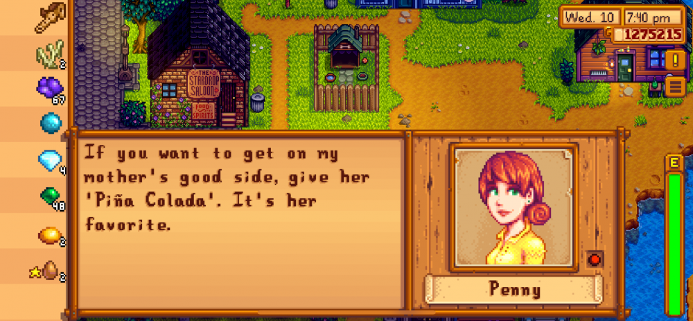 Thanks to Maher's reminder, I now have a quarter-greenhouse full of starfruit, and in a few days I can harvest them. Collecting things for the beach and desert portals. Planning on building two fish ponds to replace farming in the lower field. I always forget to check it. (Riverside Farm.) Beat Willy in the ice-fishing fest, neener neener. Accidentally cheated on Penny when I triggered the "Emily and player camp out together in the secret forest" cutscene. Penny's used to me passing out in the middle of nowhere, so presumably my player pulled it off.