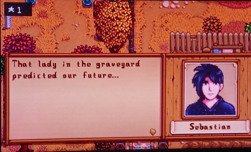 - My farmer took Sebastian on a date night to the theater since he likes the Fall movies. Thinking of asking Krobus next.