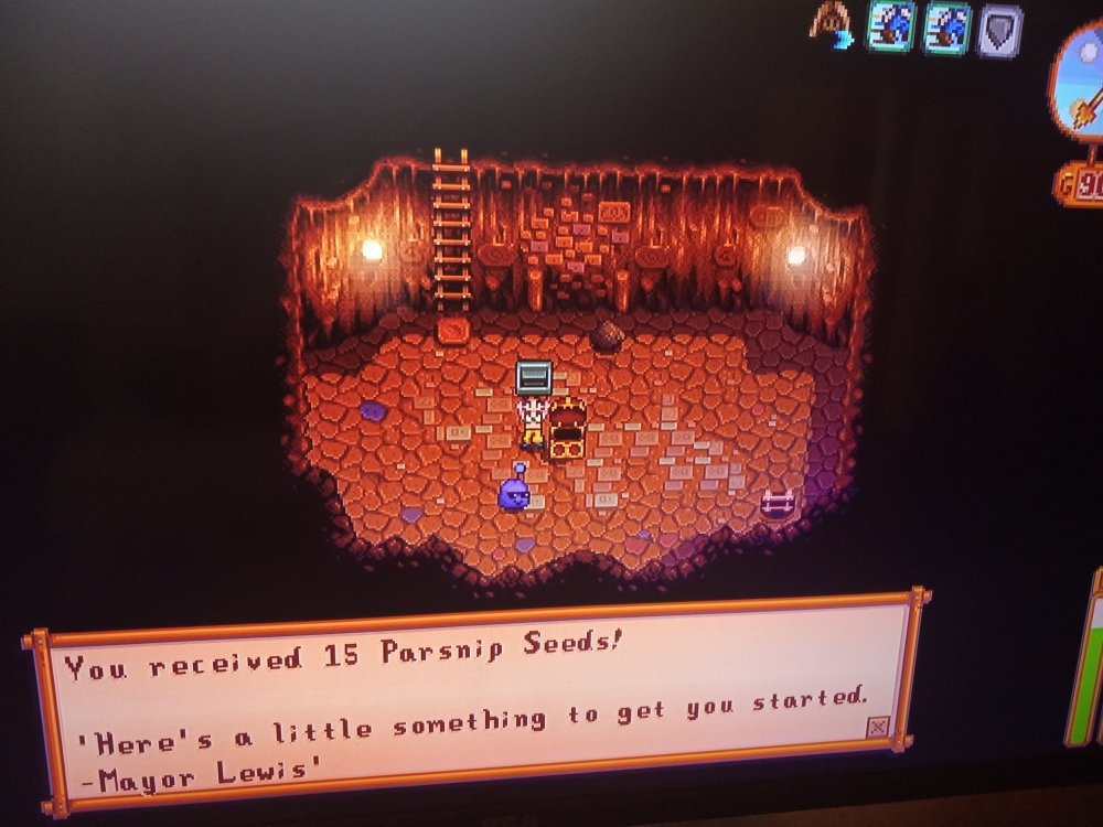 Lewis flexing on ya and telling you to go back farming in one shotToday in the Skull Cavern, I found a perfectly ordinary treasure room, but the treasure was 15 Parsnip Seeds, with a note attached.