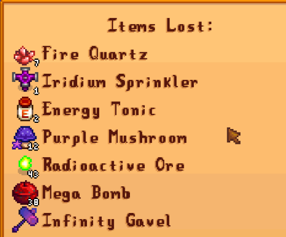 Note to self: Bring a phoenix ring to the dangerous skull cavern. I didn't know you could lose so much stuff.Oh yeah, I was doing hard mode SC the other day. 11:30pm, got some nice loot, hit floor 100 and got the Qi gems. I died and was thinking "well, okay, if I don't lose anything too valuable I can just leave it and not reset the day". And it was a best luck day, so I figured I wouldn't lose too many items at least. This is what I lost: